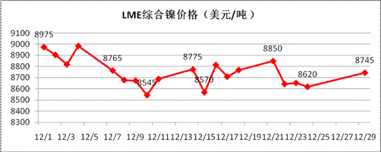 對于來年1月份走勢判斷,從技術面看,倫鎳在未站穩8800美元/噸以上時,市場仍舊存在下跌至8100美元/噸一線的風險,甚至存在創新低的可能。從基本面看,倫鎳庫存依舊高位,表面看市場供應繼續充足,但從中國進口精煉鎳、鎳鐵的量來看,并未呈現繼續增加的態勢,可見實際國外供應量已基本接近現有峰值,國內將進入去庫存化周期,對于鎳市短期而言弱勢盤整是主流。