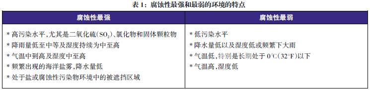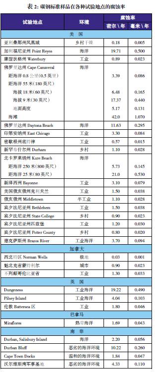 世界各地都進行過各種應用環境下的金屬腐蝕性能比較試驗。以碳鋼為標準樣品對這些試驗地點的腐蝕性進行了比較。表2給出了標準樣品在北美試驗地點的腐蝕率數據。盡管某些地點處于經常使用除冰鹽的地區,但樣品并未暴露于除冰鹽之下。