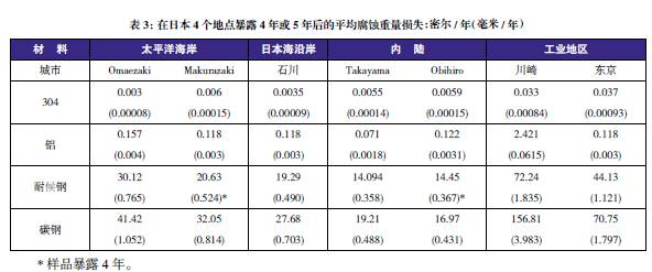 表3至表6的數據來自于日本、巴拿馬、Kure 海灘(北卡萊羅納州)和南非的試驗地點。可利用這些數據在類似環境中選擇適當的金屬材料,進行生命周期成本分析。