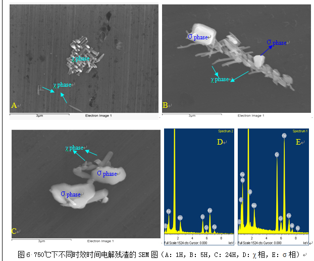 (4)實驗考查了750 ℃回火不同時間試樣的不同析出相的組成與元素含量,從中可以看到,隨著回火時間的延長,金屬間相的含量呈明顯上升的趨勢,從1H時的0.547 %上升到24H的5.802 %。在時效開始時先形成金屬間相χ相,而隨著時間的延長,σ相逐漸形成并最終占主量。