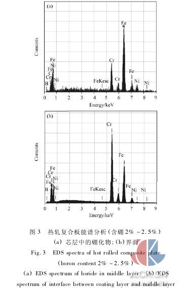 對(duì)熱軋后芯層中的硼化物及復(fù)合板界面處進(jìn)行了eds分析,結(jié)果如圖3及表2所示。芯層中硼化物的b含量達(dá)到42.72%,原子分?jǐn)?shù)達(dá)到79.23%,根據(jù)fe-b二元相圖[8],判斷該物相的成分中含有fe2b相。芯層中的硼化物除含有較多的fe 外,還含有一定量的cr、ni。cr元素由于是易形成碳化物的元素,而且具備生成cr-b化合物的熱力學(xué)條件,因此推斷該相中cr的存在形式有兩種: cr的碳化物和cr2b,綜上可知芯層塊狀硼化物的主要成分為: cr的碳化物,fe2b和cr2b。界面處硼含量較低,但cr含量較高,說明界面處的組織仍主要是α-fe基體相,但界面附近存在有少量由芯層越過界面擴(kuò)散到覆層而形成的二次硼化物。
