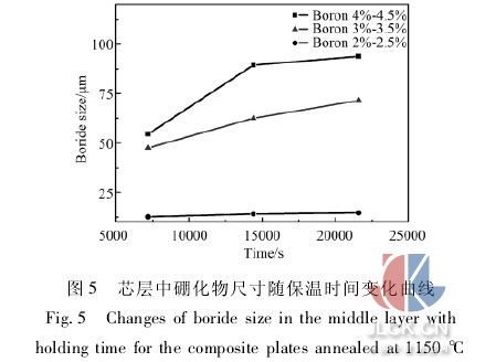 復(fù)合澆鑄過程中芯層與覆層界面處的間隙通過大變形量的熱軋變形完全可以實(shí)現(xiàn)冶金結(jié)合。擴(kuò)散處理過程中硼原子在界面附近的擴(kuò)散速率很低并且隨著中間層硼含量的增加變化的程度不大。隨著保溫時(shí)間的延長(zhǎng),硼原子的擴(kuò)散距離也在增加,但其擴(kuò)散速率是逐漸降低的。雖然硼化物在保溫過程中的粗化行為近似滿足